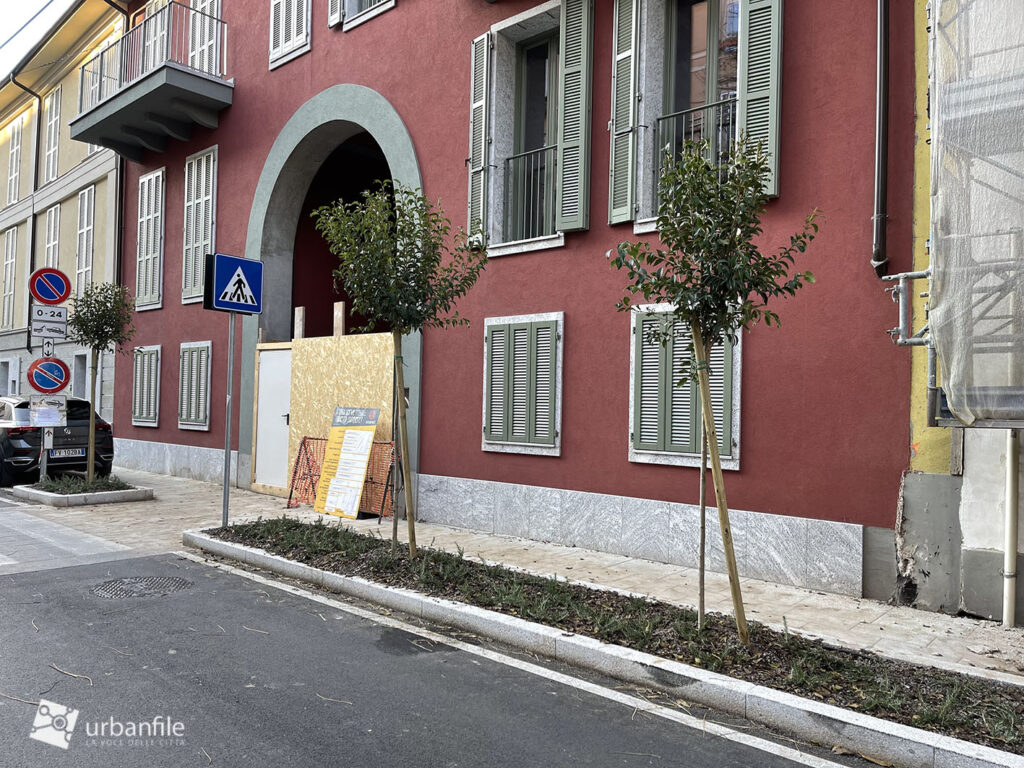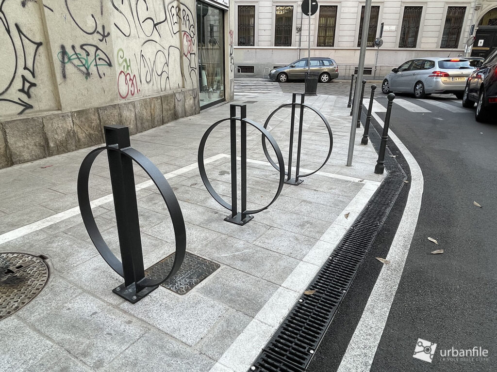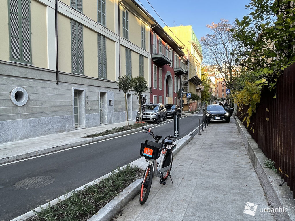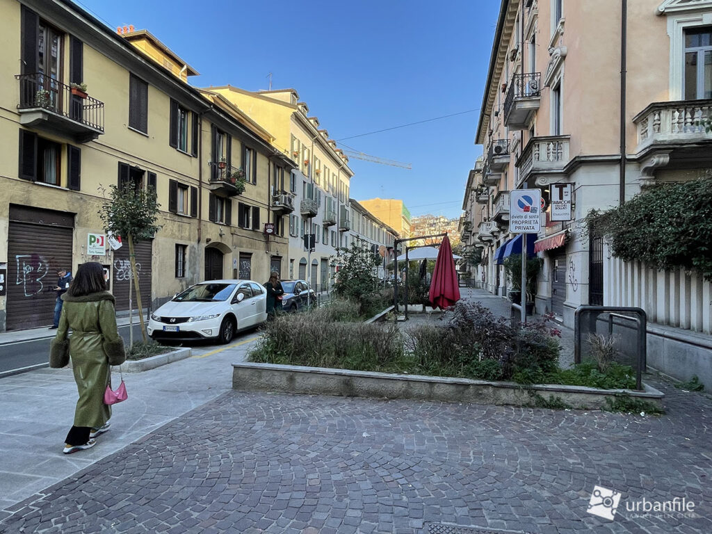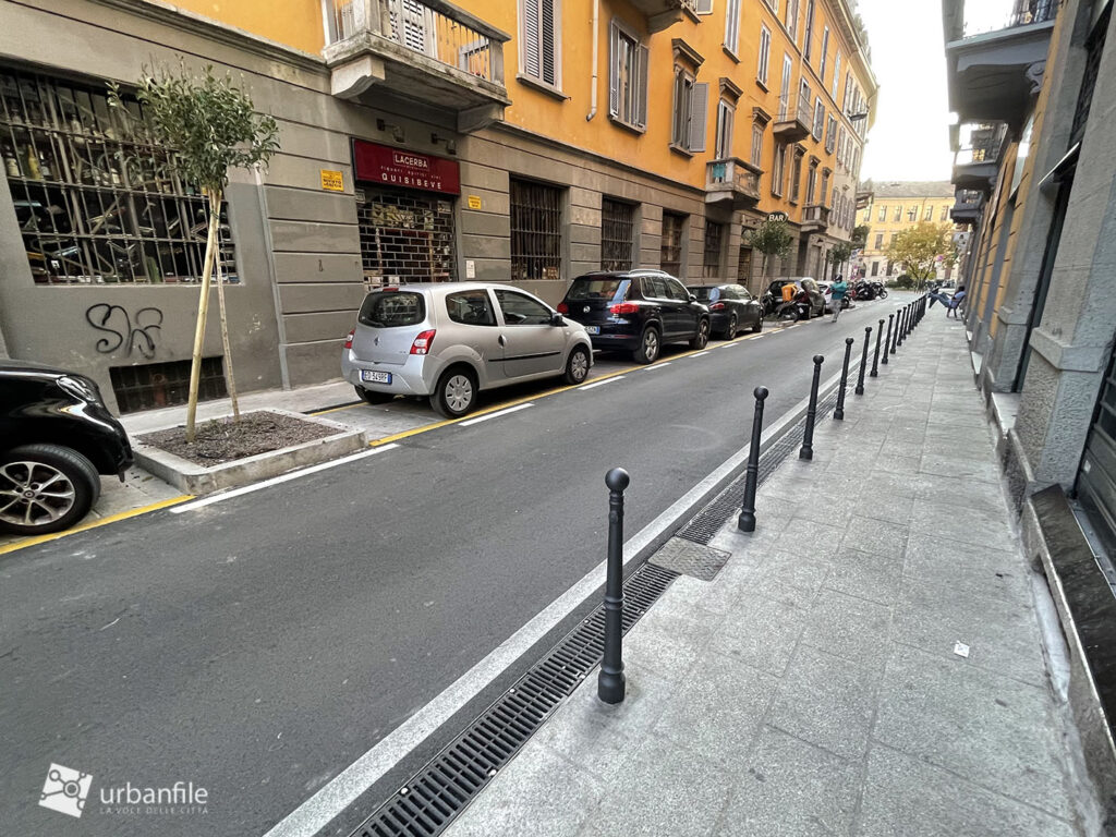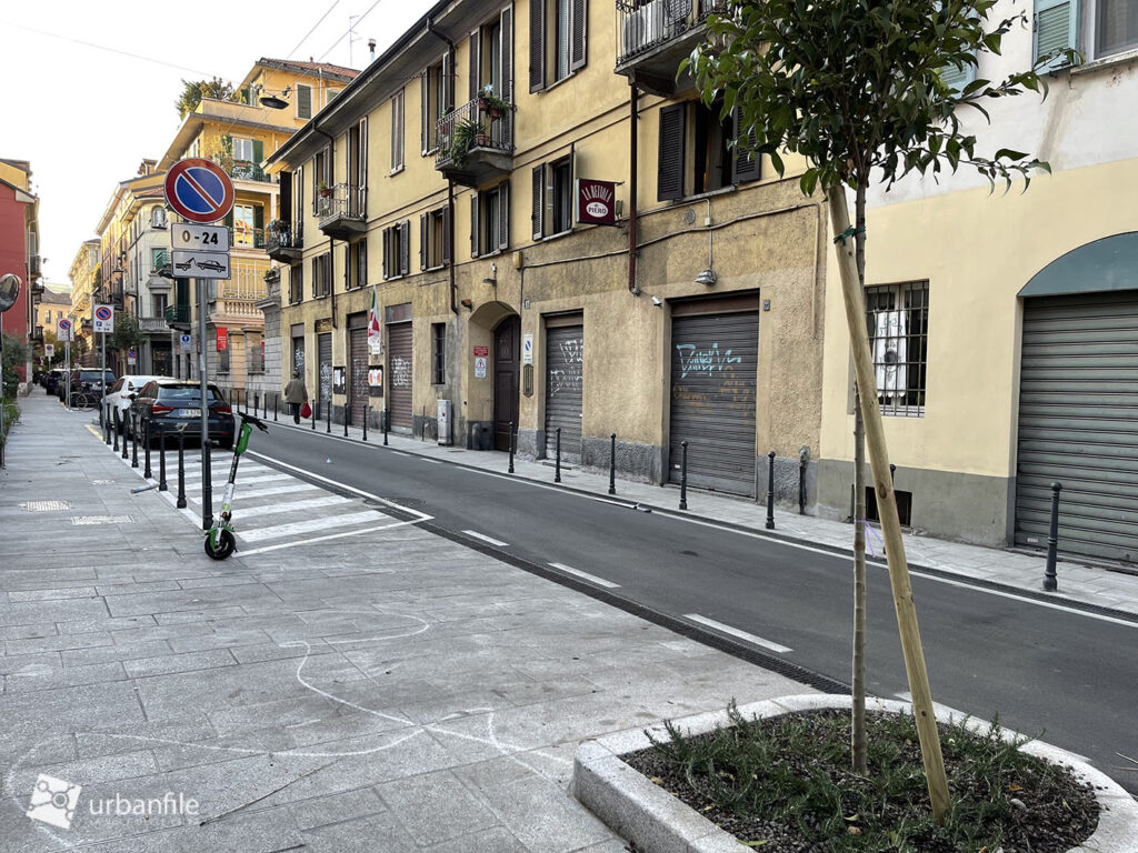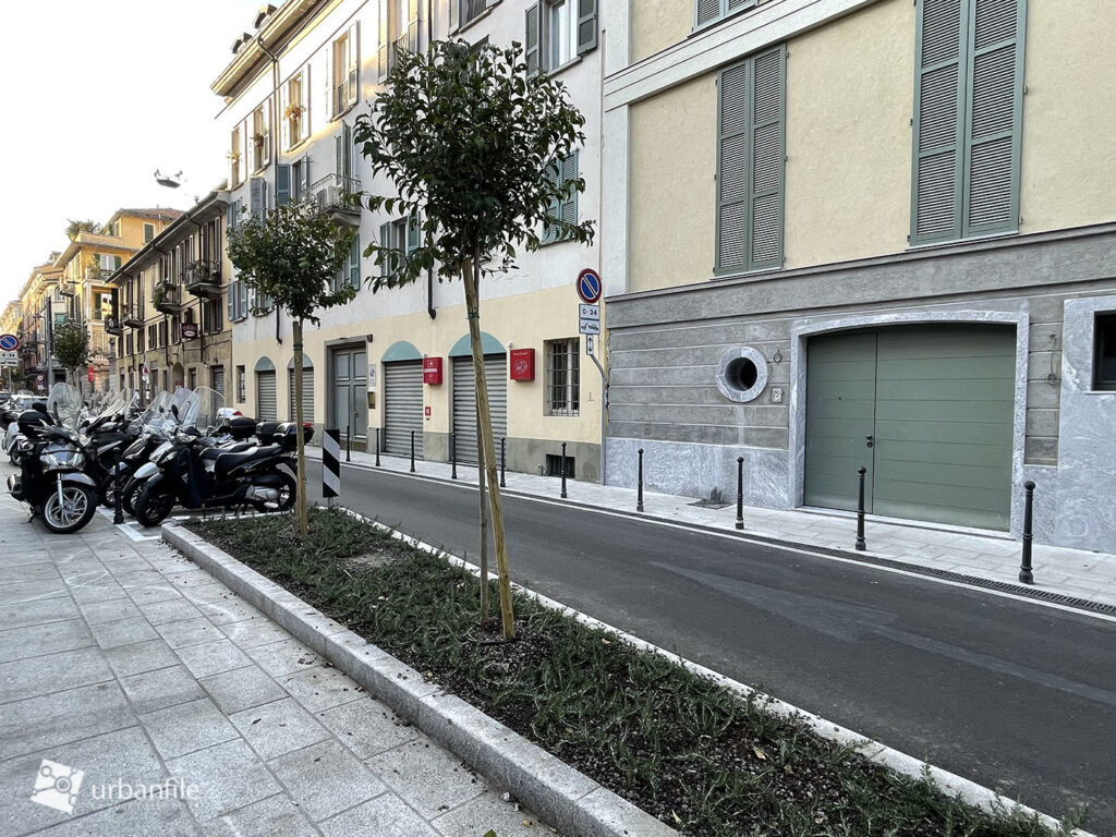 Peccato per l’illuminazione, classico tallone d’Achille dell’arredo urbano milanese. Anche senza realizzare un costoso impianto per dei lampioni, bastava sostituire i punti luce appesi con la versione a coppetta “d’epoca” (che invece viene usata in vie che di storico non hanno nulla, boh).