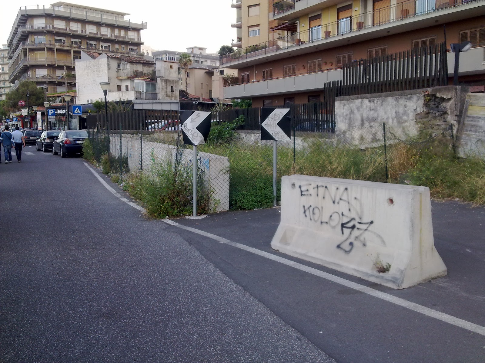 Come se non bastasse, dopo la chiusura del cantiere, non si è neanche pensato di realizzare un marciapiede decente lungo il lato ovest della strada, che si presenta senza appositi spazi per i pedoni e in modo quanto mai disordinato, addirittura con blocchi di cemento a delimitare un perimetro inopinatamente lasciato irregolare.