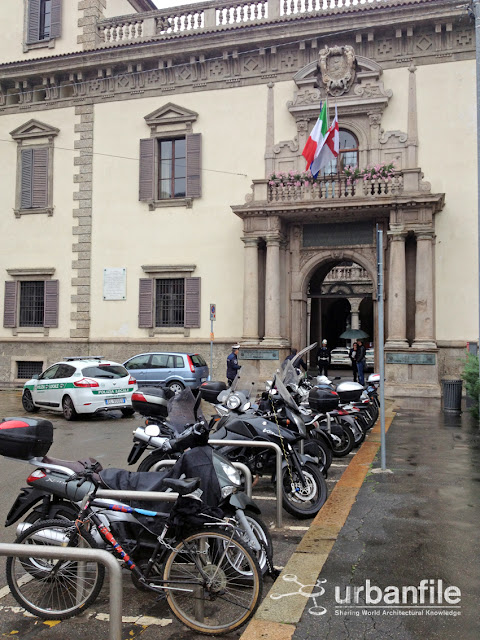 Infelice a mio avviso la soluzione di collocare una rastrelliera per motocicli proprio davanti all’ingresso. Ancora una volta chi si doveva occupare dell’arredo urbano e dell’estetica di questa città evidentemente in quel momento dormiva. Ecco la foto che testimonia l’ennesima cecità in questo senso. Spero che i lavori per la sistemazione della neo-pedonalizzata piazza Beccaria forniscano a chi di dovere idee alternative su dove spostare auto e motorini perché, così com’è, è poco rispettoso per la monumentalità del luogo.