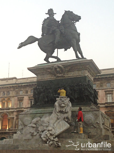 Stamattina presto, ho potuto vedere come viene tenuto pulito il monumento a Vittorio Emanuele in Piazza del Duomo. Anni dove il guano dei piccioni non veniva mai tolto, sistemi diversi per tenere lontani gli animali, ma con scarsi risultati, tanto che il monumento prima del restauro, avvenuto qualche mese fa, era letteralmente ricoperto da escrementi dei volatili. Dopo l’ultimo restauro avevo notato che non erano state istallate le solite “spine” scaccia volatili o cavi elettrificati come si usava un tempo e mi chiedevo come avessero intenzione di tenere lontani i fastidiosi pennuti. Da quello che ho visto mi pare che in comune abbiano trovato la soluzione migliore e più efficace, getto d’acqua ad alta pressione e spazzole, con frequenza pianificata.