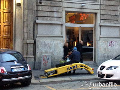 In via Mercato un musicante di strada pare abbia trovato un nuovo utilizzo per la palina dei taxi abbattuta per non si sa quale motivo. Con estremo dispiacere per il nostro sfortunato mendicante, speriamo che al più presto la palina dei Taxi troni ad essere verticale come le si compete e quindi non possa più fungere da sedile.