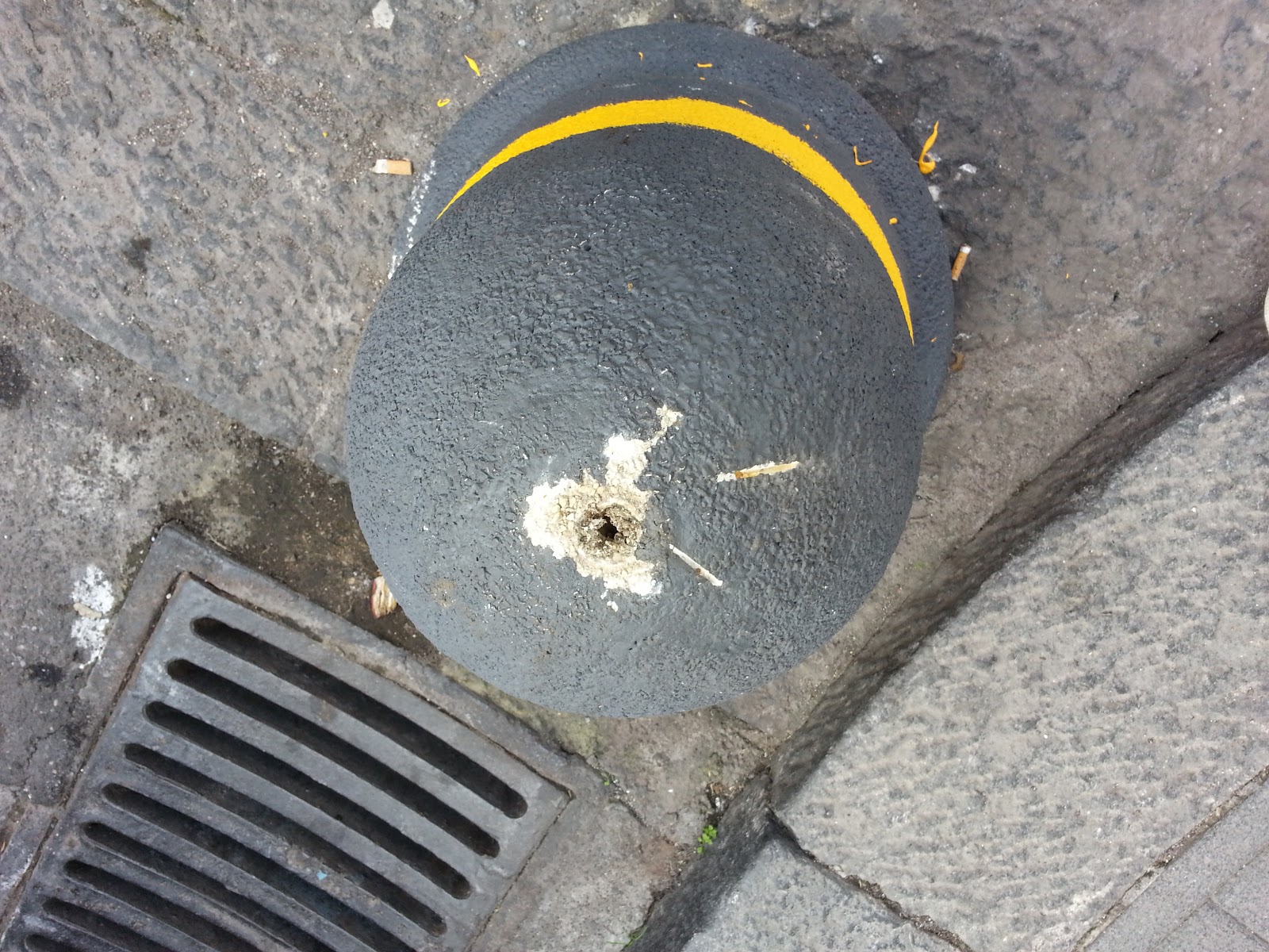 | Dettaglio della sommità di un dissuasore. Gancio per catena mancante? |