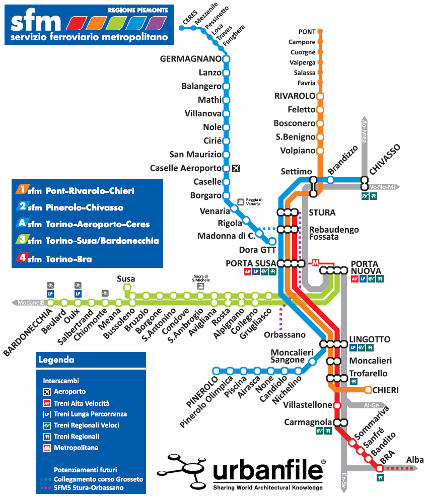 Le prime cinque linee, Pont-Rivarolo-Chieri, Pinerolo-Chivasso, Torino-Aeroporto di Caselle-Ceres, Torino-Susa/Bardonecchia e Torino-Bra/Alba, ogni giorno, da lunedì 10 dicembre 2012, saranno percorse da 256 treni sfruttando il completamento del passante ferroviario di Torino che dopo 35 anni di trasformazioni vede terminare i lavori di interramento e quadruplicamento. Si avvia così una versione torinese della Rer di Parigi, la ferrovia che congiunge vari punti della città con i comuni della cintura. Il servizio sarà regolato mediante l’introduzione dell’orario cadenzato: i convogli fermeranno ogni mezz’ora oppure ogni ora a seconda delle fasce orarie e saranno previsti interscambi e coincidenze con il trasporto su gomma.