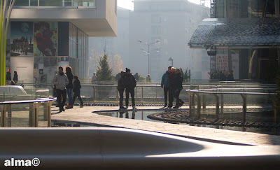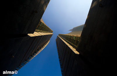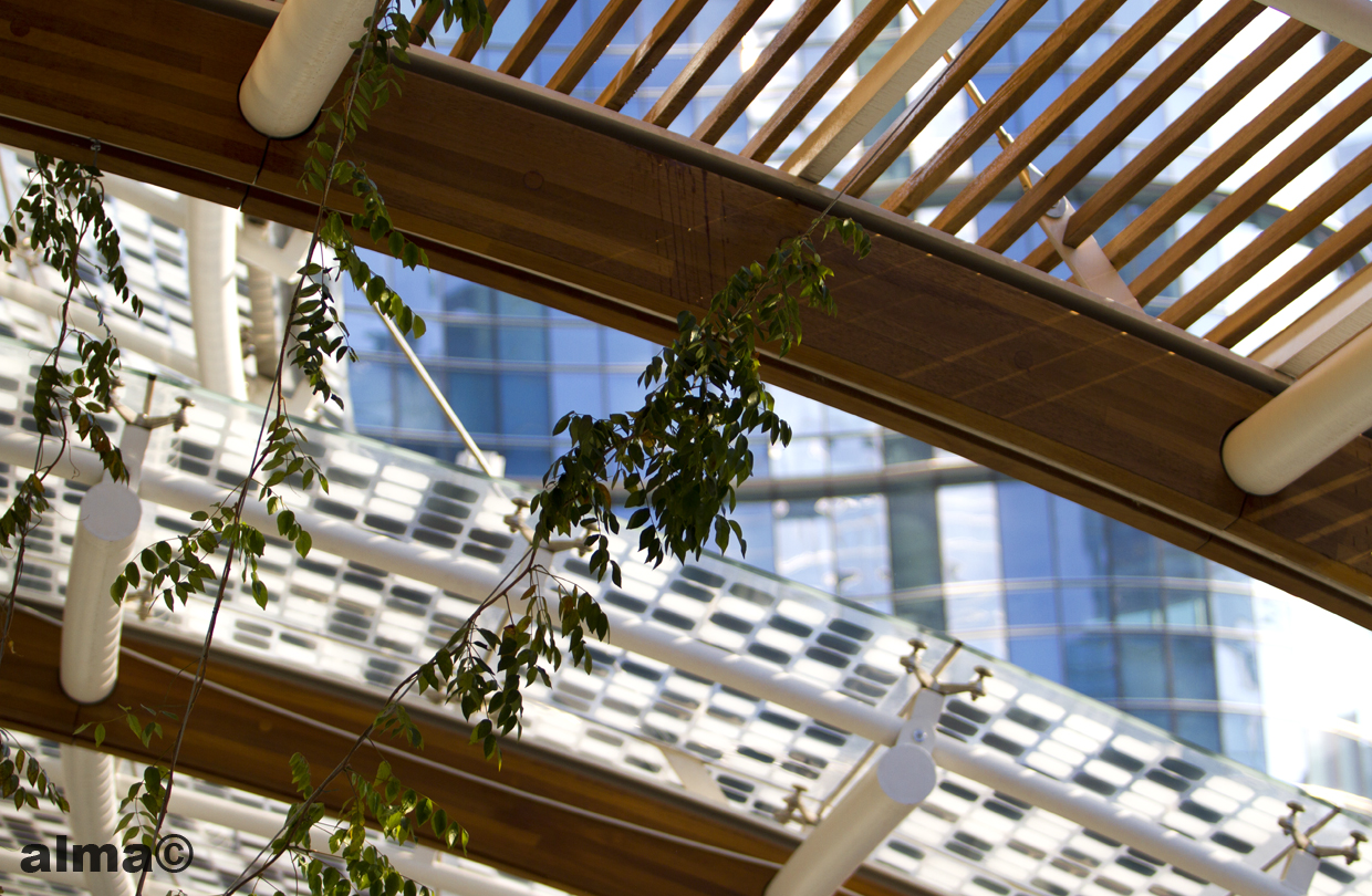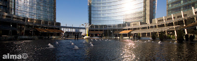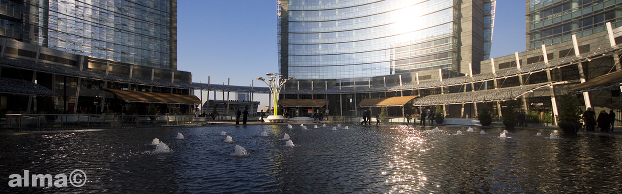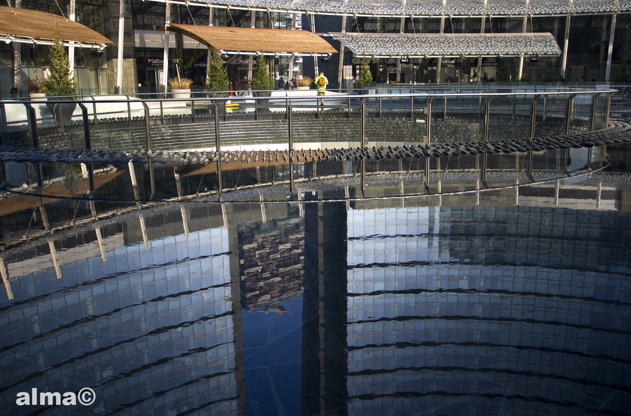 2.300 metri quadri di “nido” circolare posto a sei metri d’altezza dal livello stradale. Le torri disegnate da Cesar Pelli e altri edifici si specchiano nelle fontane poste al centro e tutt’attorno una corona di boutique pronte per il 2013.