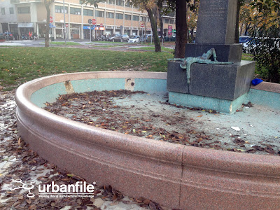 Oggi la scultura (non ho visto segni d’acqua essenziali per essere ritenuta fontana), pare abbandonata. Ripulita dalle scritte dei vandali, priva ancora del gatto e della volpe, giace solitaria e abbandonata sebbene a due metri dai giardinetti appena sistemati per i bambini della zona.