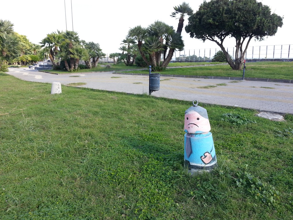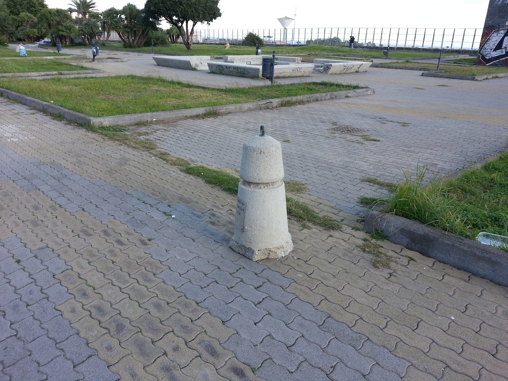 Piazzale Oceania, Catania. A due passi da piazza Europa e da viale Jonio: un’area prospiciente il mare, in particolare il porticciolo turistico Rossi, il Caìto, nei pressi della stazione Galatea della metropolitana e della futura stazione Europa del passante ferroviario urbano. Un tempo anche ricca di palme, oggi purtroppo decimate (ma non è una novità, a Catania) dal punteruolo rosso. Un’area, dunque, di potenziale pregio, area pedonale estesa e ricca di verde (sulla carta), dove poter fare una piacevole sosta durante le passeggiate lungo la costa. E in effetti, carenza di decoro urbano a parte, non è che sia messa poi così male, anche se spicca l’assenza di illuminazione notturna, grave pecca: fino a qualche anno fa era garantita da molti paletti-punti luce, ormai scomparsi o non funzionanti. Speriamo che venga ripristinata quanto prima.