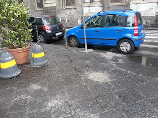 Nella stessa piazza, provenendo da via Porta di Ferro, i dissuasori sono ancora posti lateralmente col risultato che le macchine continuano a entrare in piazza e a utilizzarla come parcheggio, danneggiando la pavimentazione e la bordatura in pietra lavica delle aiuole. Eppure in piazza non ci sono passi carrabili (esiste un cancello con un malconcio segnale di divieto di sosta, ma è abusivo):
