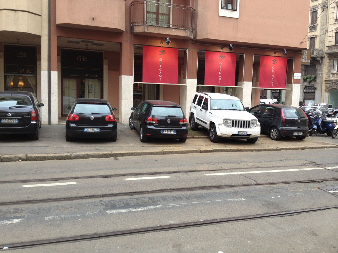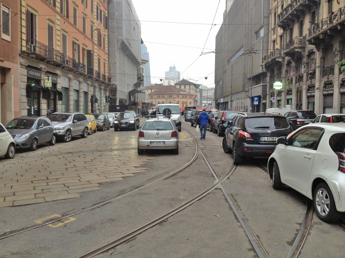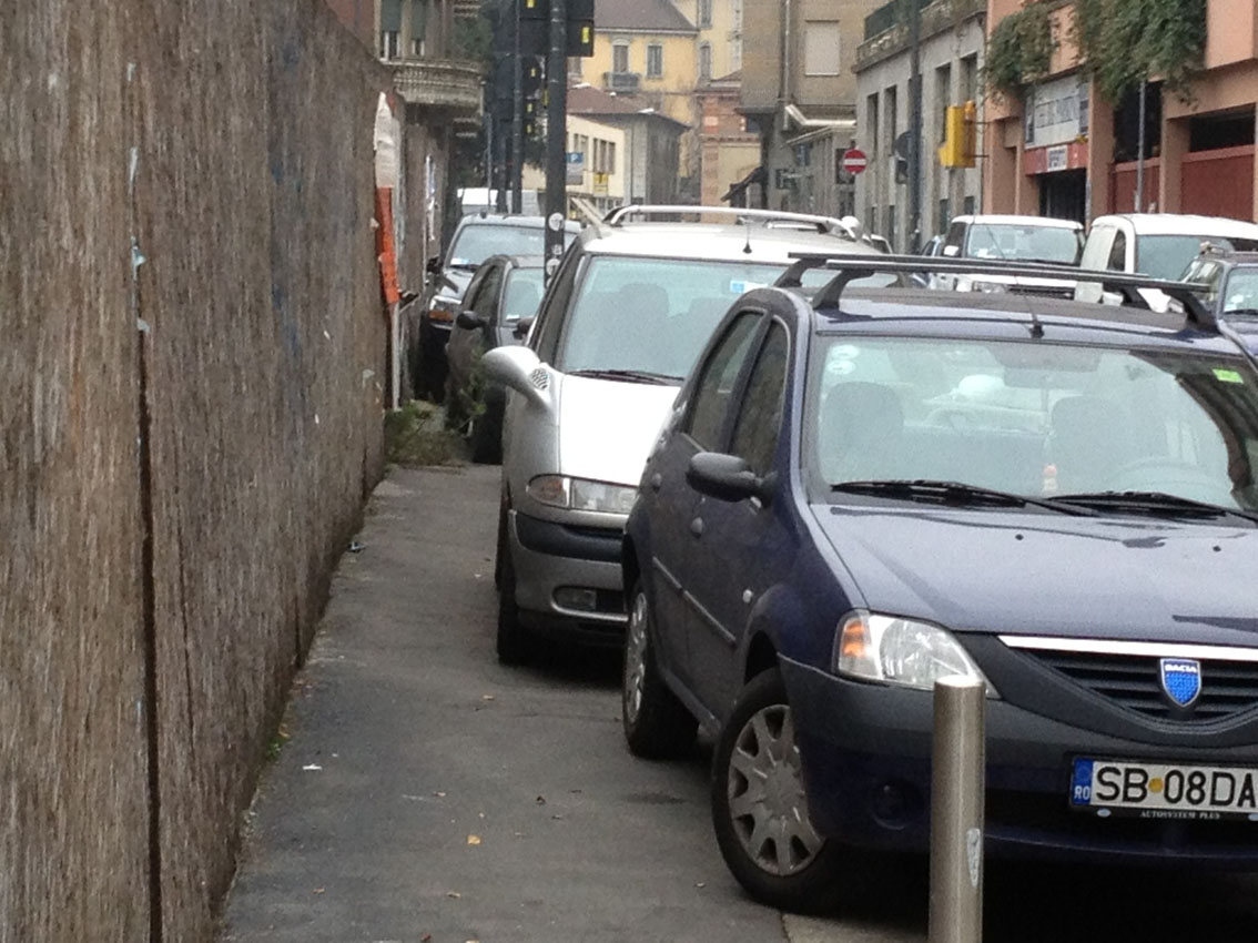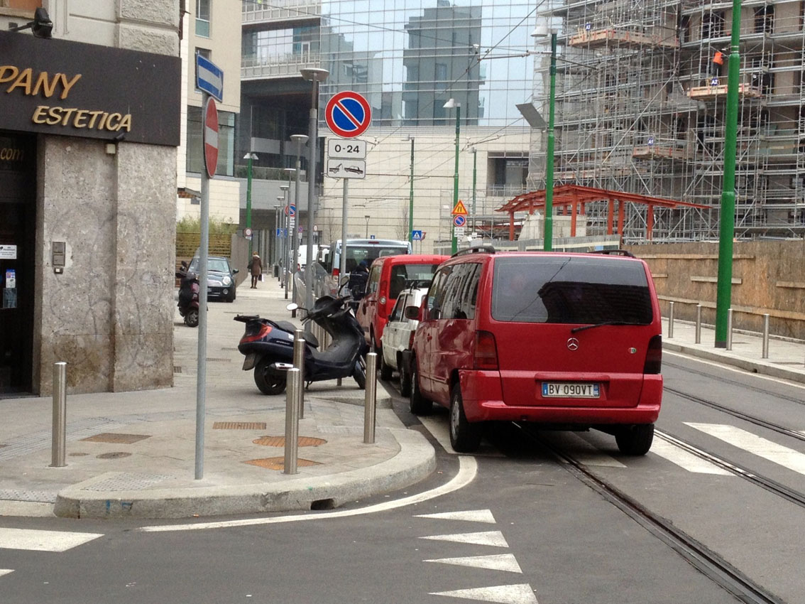 Milano è sommersa dalle auto. Questa è la situazione in zona Porta Garibaldi ma succede un po’ ovunque per tutta la città. Auto parcheggiate sotto i cartelli che lo vietano, fregandosene altamente, auto parcheggiate su aiuole, auto parcheggiate sui marciapiedi e via discorrendo. Questo accade tutti i santi giorni senza ombra di alcun vigile.