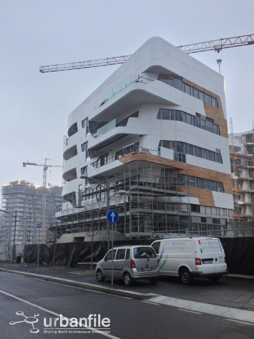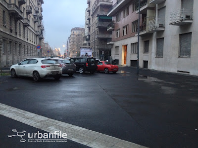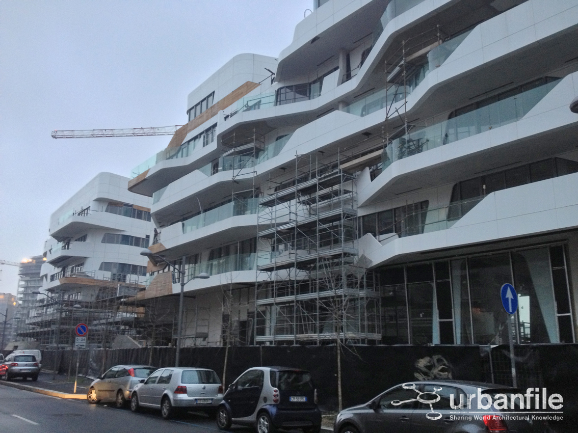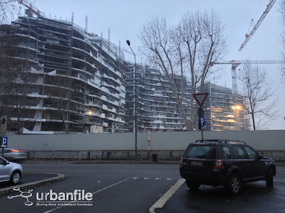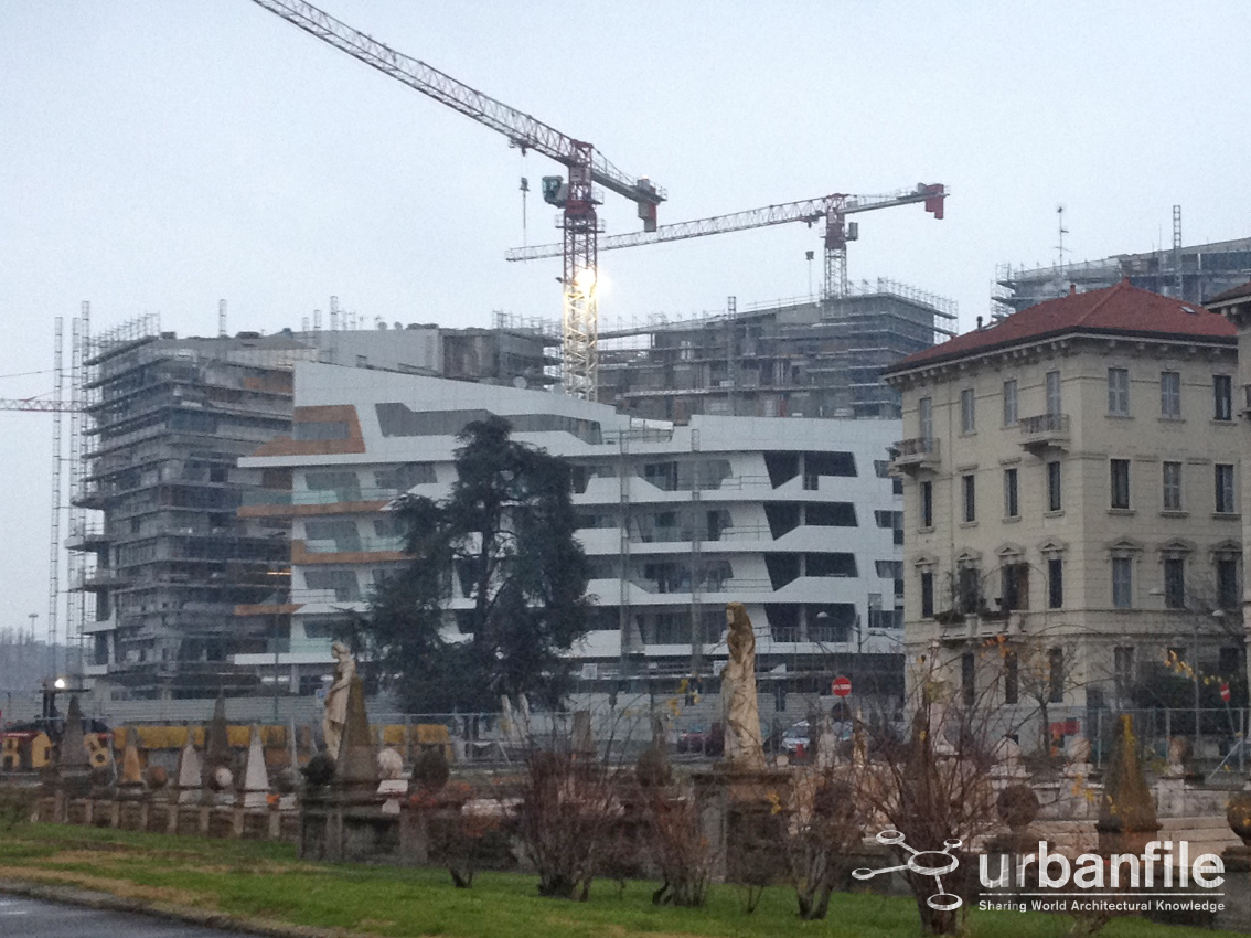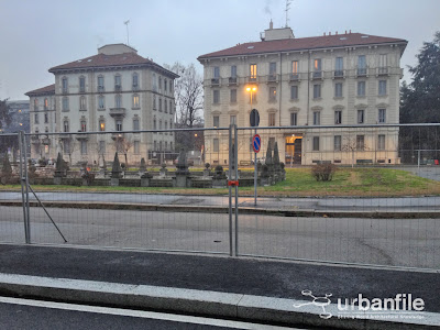 Mi scuso per le foto semi-notturne, non sono riuscito a passare durante le ore di luce. Si riescono comunque a vedere i progressi delle residenze progettate da Zaha Hadid. Le difficoltà realizzative per le pannellature in legno volute dall’architetto hanno pesato sulla realizzazione delle residenze: i lavori sono più lunghi del previsto. A questo punto però si inizia ad intravedere quello che potrebbe essere il risultato definitivo. E a mio parere per ora lasciano un po’ perplessi: sono sicuramente dei bei palazzi, ma dalla forma così particolare da irrompere nella “monotonia” milanese con grande forza. Forse il problema è che sono troppo “bianchi”, ma attenderemo la loro conclusione per giudicarli meglio. Segnalo infine che l’area attorno alla fontana in piazza Giulio Cesare è stata cantierizzata, forse per iniziare i lavori di ristrutturazione.