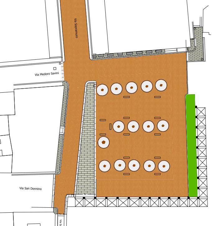 “Lo studio compositivo unitario, che ha dato luogo al progetto originale, si basava fondamentalmente sull’analisi dei documenti cartografici e prevedeva la pavimentazione di tutta l’area (via Sopramuro e Piazzale Plebiscito) con cubetti di porfido posati ad archi contrastanti secondo due direzioni di posa così da distinguere l’asse viario in due tronchi: