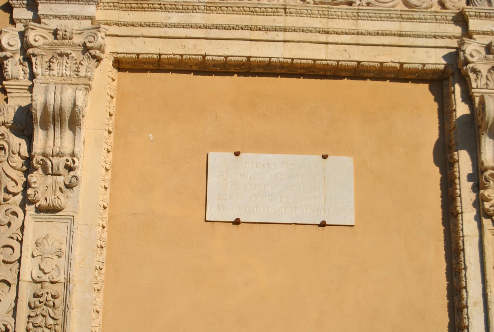 Portale del San Nicola ai Trixini.Particolare della lapide che ne ricorda la provenienza. |