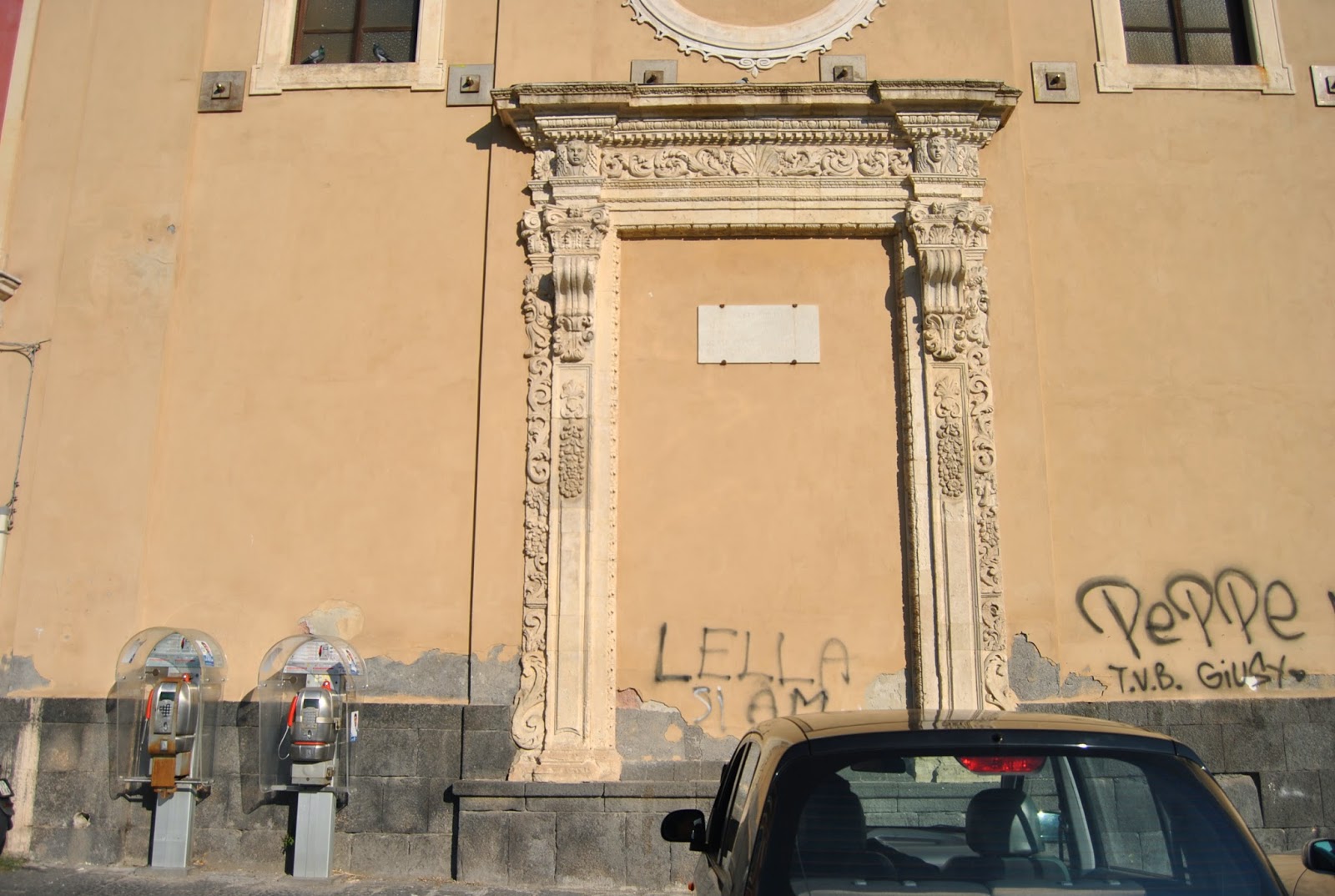 Rustica del palazzo Carcaci. Nell’angolo basso a destra era dimenticata la Pietra del Malconsiglio. L’arco riecheggia lo stile gotico-catalano di Sicilia. |