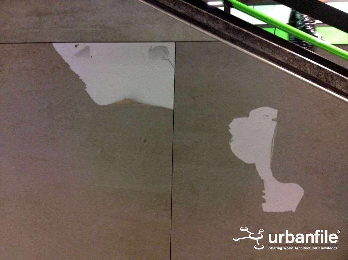 Se non erro la stazione Garibaldi è stata ristrutturata circa due anni fa. E’ stata cambiata tutta la pavimentazione, le pareti sono state ricoperte ovunque da dei pannelli metallici rivestiti da una pellicola che riproduce la finutura di un metallo acidato. Bene, questi pannelli dopo solo due anni dalla posa si stanno spelando come quando la pelle scottata dal sole in estate si secca e squama.
