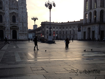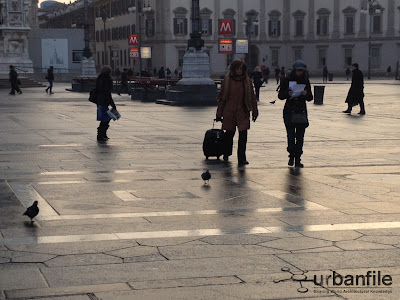 In inverno, specie in giornate come oggi, molto umide e fredde e la mattina presto, la pavimentazione di Piazza del Duomo diventa una pista di pattinaggio. Non so quali siano le tipologie di pietra usata per il disegno della piazza, progettato dal grande architetto Portaluppi, ma ce n’è più d’una che in certe condizioni meteo diventa viscida e scivolosa creando piccoli “scivolini” (se scarlìga come dicono i vecchi milanesi) ai passanti.
