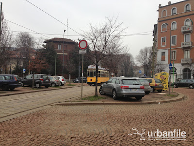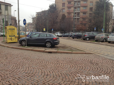 Sì, perché questa piccola piazza in zona Città Studi ha un’isola centrale spartitraffico, sempre ricoperta dalle auto parcheggiate. Non sarebbe meglio alzare l’aiuola con doppio cordolo (questo impedirebbe il parcheggio selvaggio) e sistemare a verde le due lunette solcate dai binari del tram?