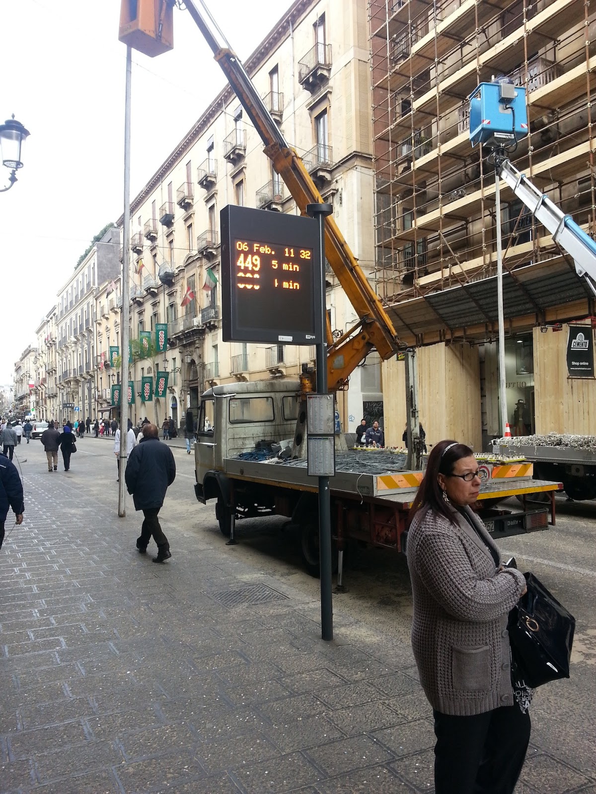 Nei giorni scorsi successivi alla Festa di Sant’Agata, la quasi totalità della via Etnea è stata chiusa al traffico per poter rimuovere la cera (conseguenza di un’ordinanza sindacale non rispettata). Situazione nota a molti ma non a tutti: parecchia gente, infatti, ha atteso invano il passaggio dei bus dell’Amt alle fermate, soprattutto nel tratto più alto di via Etnea, poiché le paline elettroniche hanno continuato a segnalare il passaggio di mezzi che in realtà non sarebbero mai passati, visto che i loro percorsi erano stati deviati.