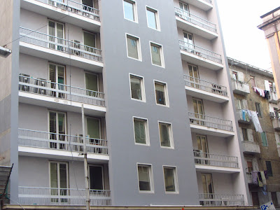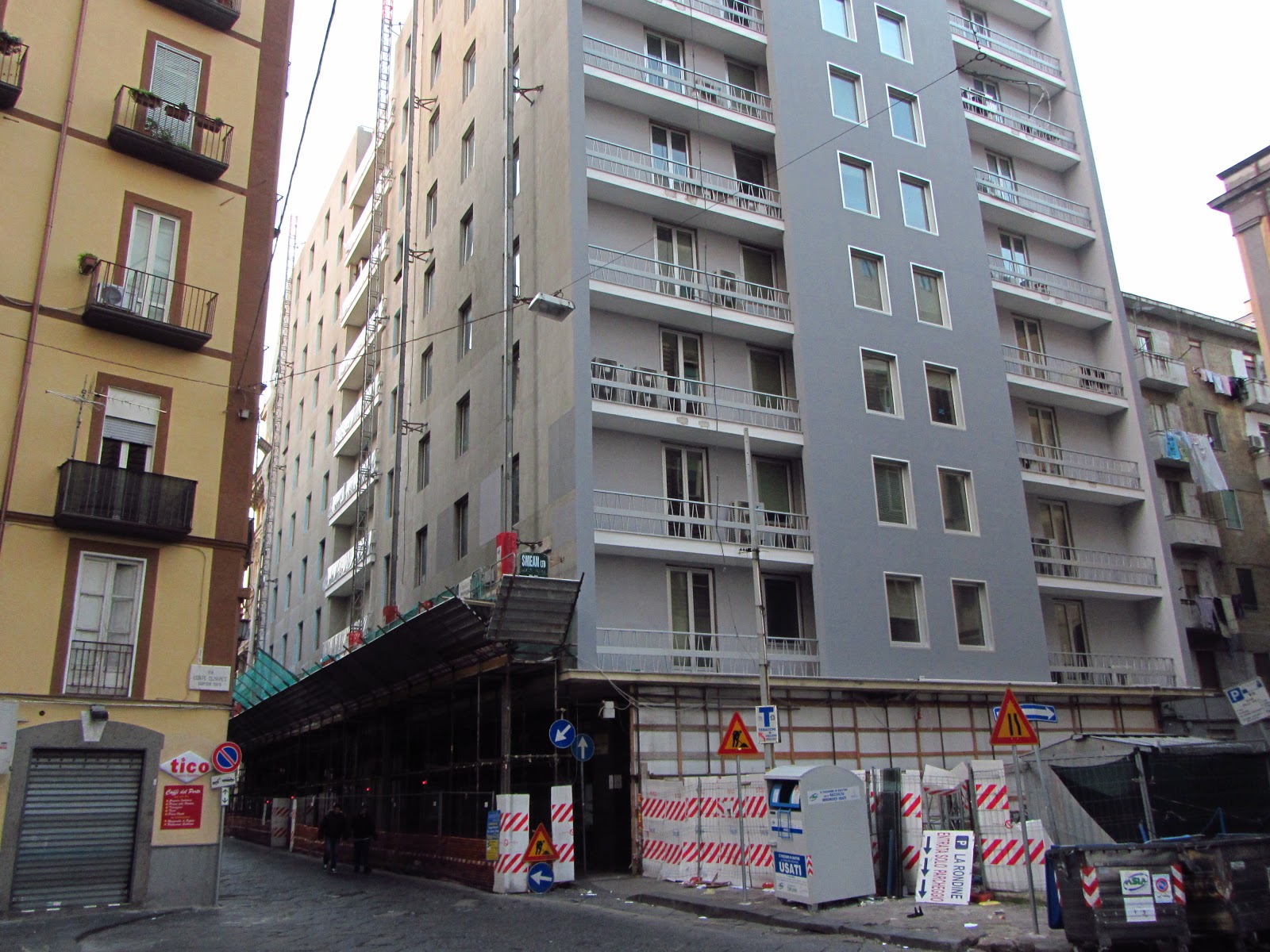 Lavori quasi terminati per il palazzo che ospita la sede della Grimaldi Lines, compagnia di navigazione, in via Marchese Campodisola. Ci troviamo nella zona interessata da quei lavori di fine Ottocento, meglio conosciuti come “Risanamento” della parte bassa della città. Il dedalo di vicoli e stradine a ridosso del porto ha visto nel corso degli anni diversi interventi architettonici, da quelli del Risanamento a quelli del ventennio Fascista, per giungere agli interventi scellerati del secondo dopoguerra che, come spesso è accaduto anche in altre aree cittadine, hanno prodotto risultati che, per usare un eufemismo, non sempre sono stati gradevoli alla vista.