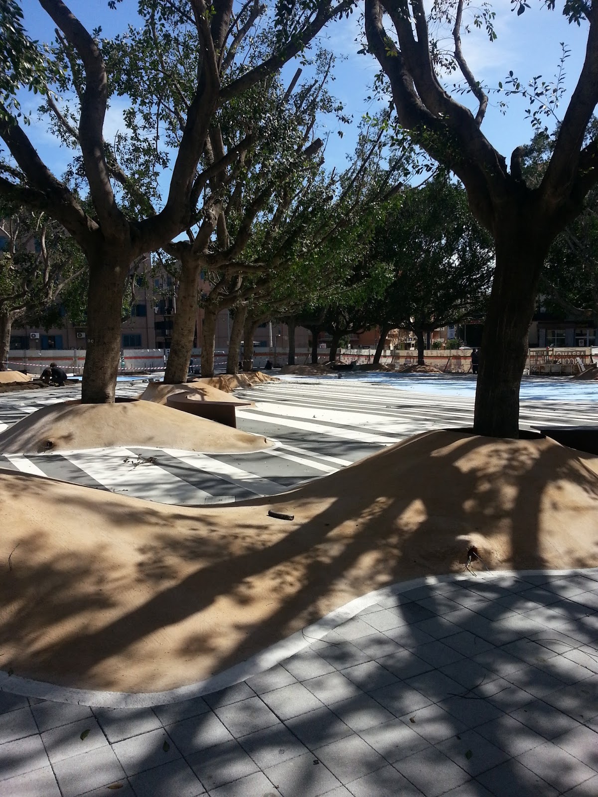Si notano già le dune di cemento attorno agli alberi (è il loro aspetto definitivo?), la nuova pavimentazione, le prime, nuove panchine e il binario che è stato mantenuto, in memoria storica del vecchio tracciato della Circumetnea. Previste anche un’area gioco per i bimbi e un’altra dedicata ai cani.