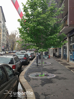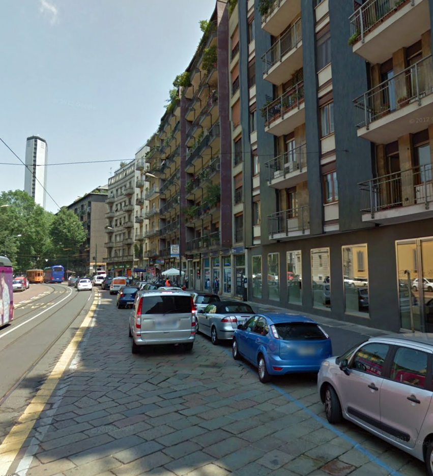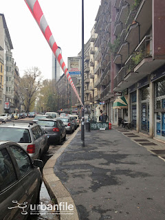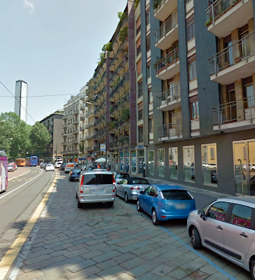 Siamo nel tratto iniziale di Via Fabio Filzi, in zona Porta Nuova e Centro Direzionale. Curiosamente la strada è alberata solo da Via Leopoldo Marangoni a Piazza IV Novembre, mentre potrebbe invece esserlo in tutta la sua lunghezza, diventando così un bel viale. Le ragioni di questo verde del tutto incompleto mi sono ignote.