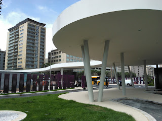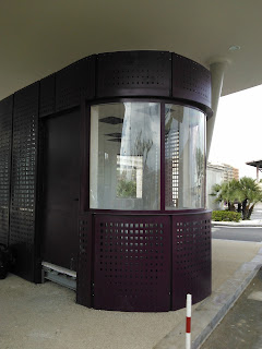 L’edificio che si compone di quelle che sembrano due biglietterie/punti informazioni, ha una linea molto sinuosa ed è rivestito da intonaco bianco. Particolari anche i pali ad incrocio ce ne sorreggono la copertura e i pannelli traforati in ferro che ne abbelliscono i lati su strada.