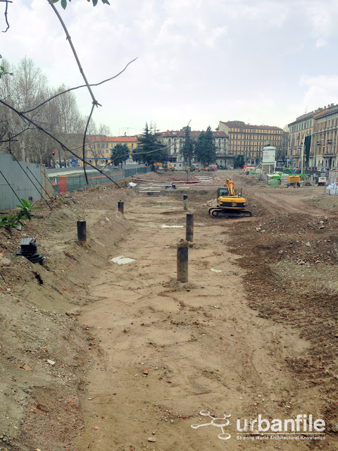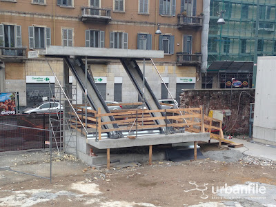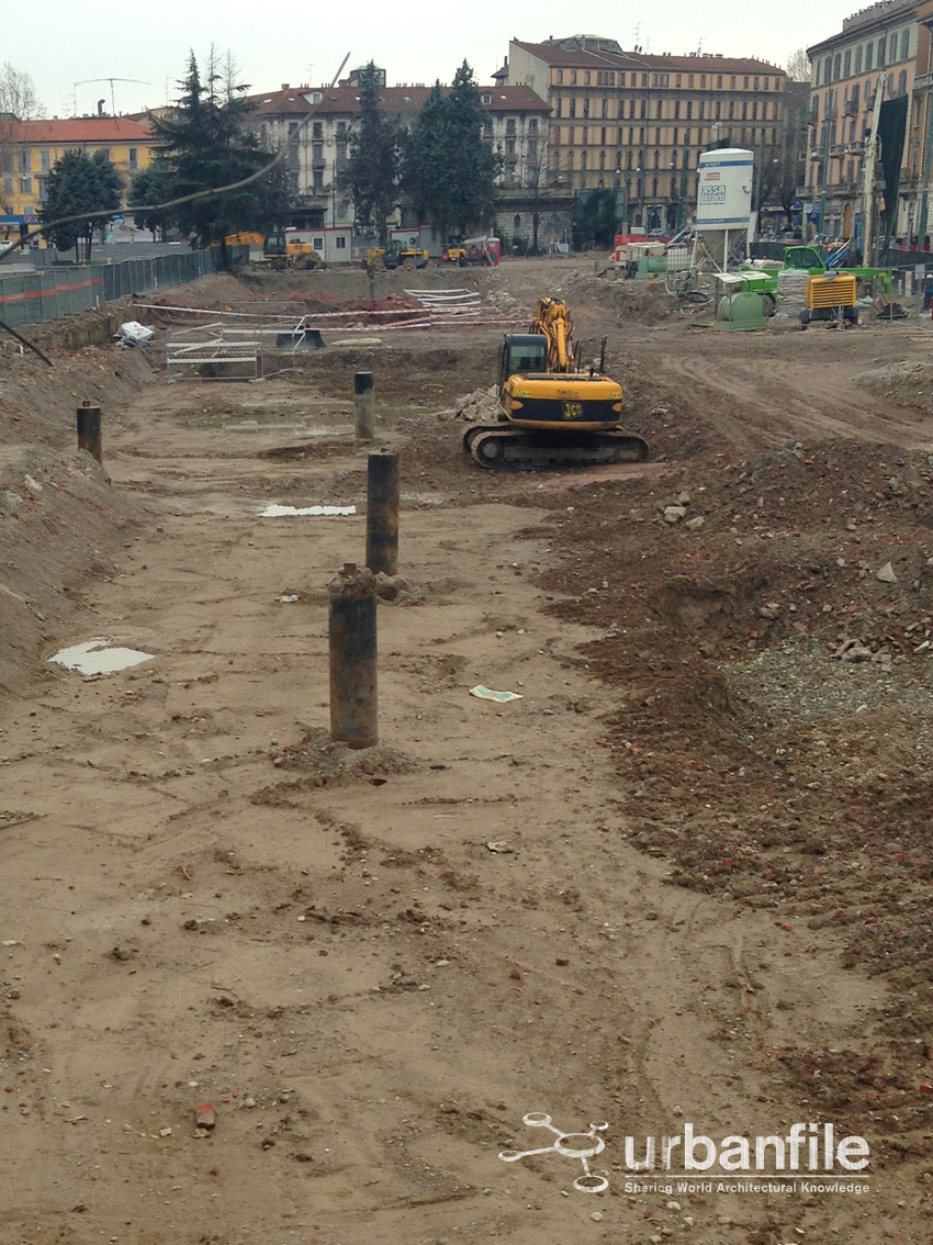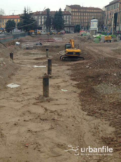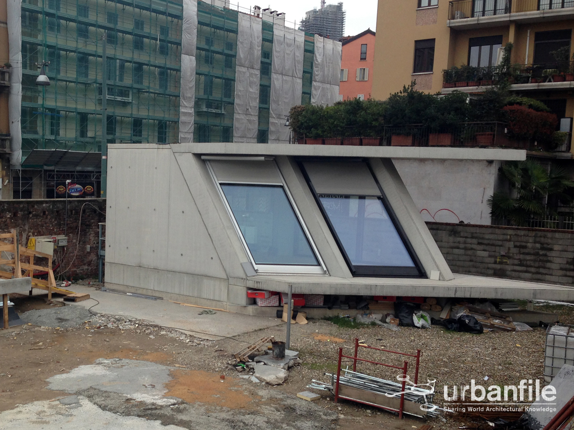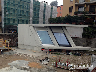 Ecco alcune foto dal cantiere di viale Pasubio per la futura sede della Fondazione Feltrinelli. Si possono vedere anche i due manufatti campione dell’edificio, della cui realizzazione mi sfugge il motivo.