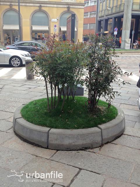 Via elegante, tra le più acclamate e glamour al mondo, assieme alla vicina Monte Napoleone. Eppure via della Spiga ha un arredo urbano dozzinale. Forse in pochi si sono accorti di come siano state fatte le aiuole all’inizio e alla fine della graziosa via, ma a noi di Urbanfile non è sfuggito. Sono formate da un cumulo di terra trattenuto da dei cordoli in cemento (solitamente usati per i marciapiedi) sistemato a verde con un po’ d’erba, dove son state posate delle piante. Di solito si fa così alle fiere temporanee, non in una lussuosa via alla Moda. Possibile che i signori del Lusso Made in Italy non possano mettersi assieme e sborsare due soldi per rendere questi interventi meno dozzinali?
