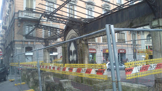 La parte occidentale della piazza (quella confinante con viale Vittorio Veneto) si presenta come una grezza colata di asfalto su cui sono presenti due colonne di epoca imprecisata e una misteriosa architettura su cui è stato ‘disegnato’ Gesù con bombolette spray. Questi tre elementi sono stati transennati e da anni sono in attesa di un intervento di qualche tipo, ma nessuno dell’Amministrazione pare curarsi del fatto che, in un nodo così nevralgico e agli occhi di tutti, della cittadinanza come dei visitatori, questo spazio comune e importante che dovrebbe essere una piazza è solo asfalto, pochi alberi e tante bancarelle: cinture, vestiti, cose del genere.