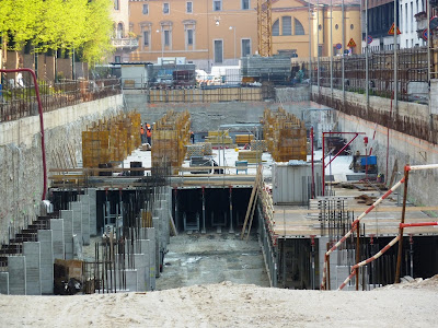 Ecco a che punto sono i lavori nel parcheggio di Sant’Ambrogio. Alla fine pare siano scesi di pochi metri, quindi presumo anche meno piani. Probabilmente il parcheggio riguarderà solamente i box per i residenti e non ci saranno più i posti a rotazione.