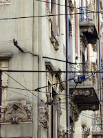 A Milano, sulle facciate di alcuni palazzi storici, sono ancora ancorate parecchie mensole tralicciate di sostegno per i cavi elettrici, risalenti all’inizio del secolo. Molte reggono ancora i fili, tesi fra un palazzo e l’altro, che all’improvviso si interrompono nel nulla, come dimenticati. Mi sono domandato come e perché vengano mantenute; o più facilmente perché siano state dimenticate. Alcune di queste strutture metalliche potrebbero essere anche pericolose: dei ferri arrugginiti fissati a venti metri da terra con cavi a penzoloni.