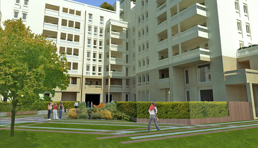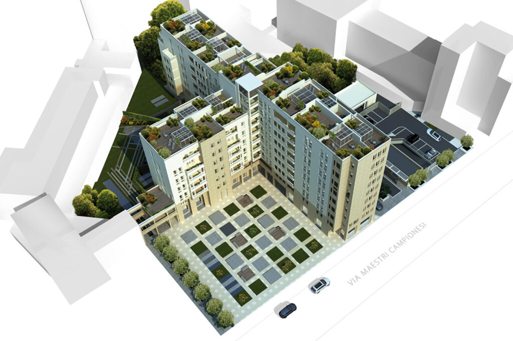 Il lotto di via Maestri Campionesi 6, ampio e collocato al centro dell’isolato, ha dato origine a un edificio di otto piani caratterizzato da una pianta a T, soluzione che consente l’apertura di uno spazio pubblico lungo la via, contribuendo a ridefinire il rapporto tra costruito e strada.