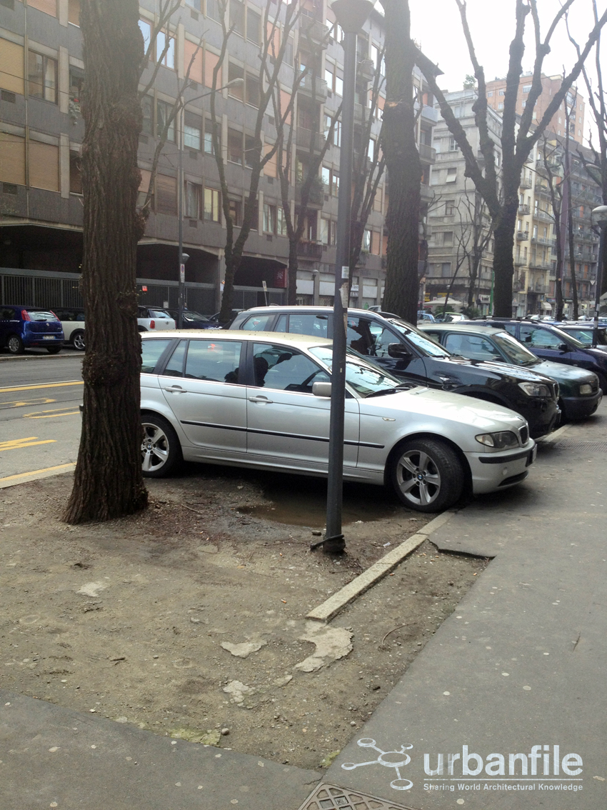 La via in questione è via Fabio Filzi, un’importante strada che inizia dall’incrocio con Viale Liberazione dove troviamo tre splendidi alberi che ombreggiano un’edicola e la graziosa chiesa di San Gioachimo, peccato che questo avvenga solo su di un lato, per giunta nel disordine totale di spazi lasciati al caso.
