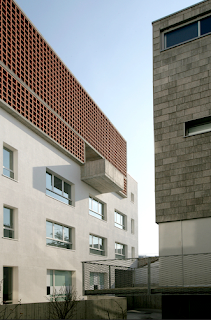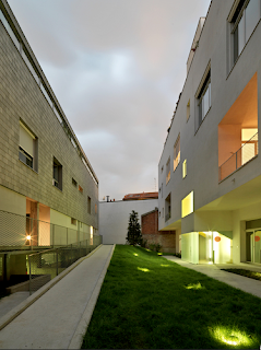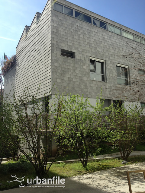 I capannoni a shed all’interno del lotto invece hanno lasciato spazio ad una nuova costruzione che trovo molto interessante. Innanzitutto ripropone la copertura a shed che era dei capannoni demoliti. Inoltre, sia l’edificio che la copertura sono rivestiti in pannelli di fibrocemento utilizzati nella tinta naturale sul lato rovescio alla ricerca di un accordo con le tonalità dei cementi della struttura e delle pavimentazioni interne alla corte.