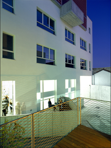 Adiacente a Luna si colloca l’intervento MASSIMIANO 25, dove è stato conservato il vecchio edificio lato strada, rielaborato e soprelevato. Il sopralzo è stato concepito come una scatola appoggiata sul tetto: infatti non solo non occupa per intero il fronte dell’edificio, ma è evidenziato dall’uso di un materiale differente (mattoni rossi) che definisce ulteriormente indipendenza del volume.