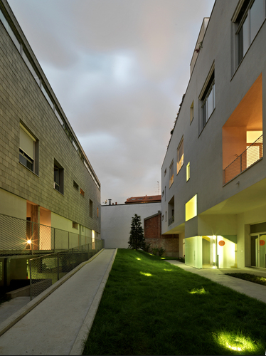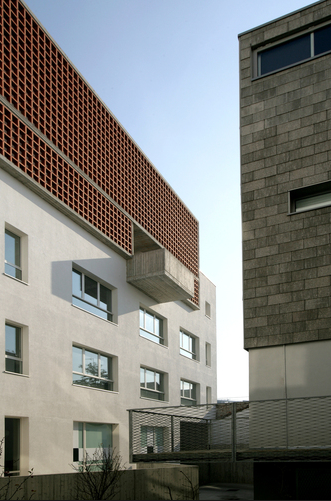 Adiacente a Luna si colloca l’intervento MASSIMIANO 25, dove è stato conservato il vecchio edificio lato strada, rielaborato e soprelevato. Il sopralzo è stato concepito come una scatola appoggiata sul tetto: infatti non solo non occupa per intero il fronte dell’edificio, ma è evidenziato dall’uso di un materiale differente (mattoni rossi) che definisce ulteriormente indipendenza del volume.