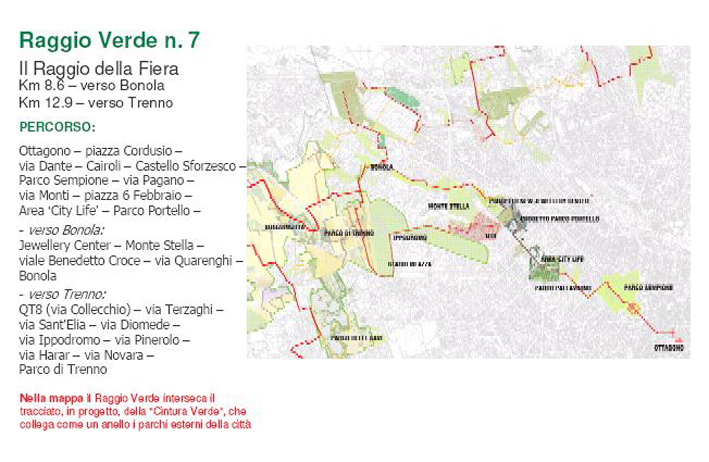 Il progetto prevede all’inizio 8 Raggi Verdi di una lunghezza media tra i 7 e i 12 Km lineari: ogni Raggio, partendo dal centro della città, arriva a uno dei grandi parchi urbani o della cintura milanese.