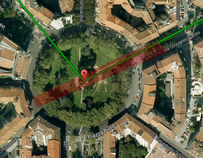 Esempio di piazza Piola: la striscia rossa in sovrimpressione rappresenta la corsia preferenziale che si potrebbe adottare in piaza Belfanti.