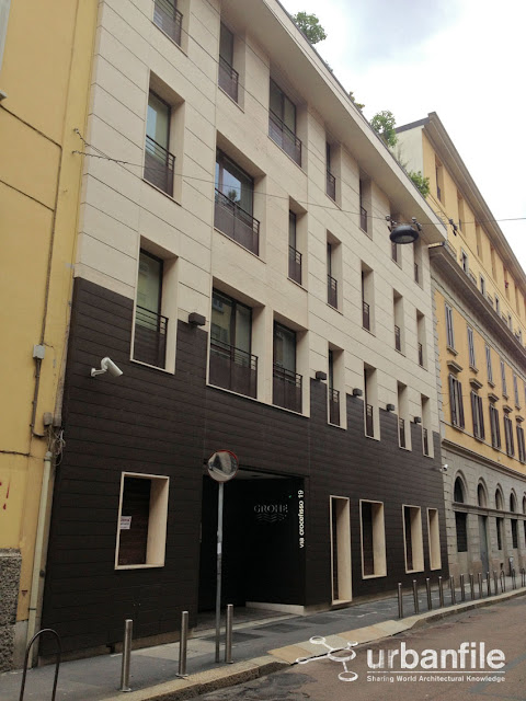 In Via Crocefisso 19 un palazzo abbastanza anonimo anni Cinquanta ad uso uffici è stato convertito qualche anno fa in un mix uffici e residenziale. Il sopralzo è un po’ particolare: presenta due balconi non allineati alla facciata. Per fortuna è abbastanza arretrato rispetto al fronte strada ed è poco visibile dal suolo.
