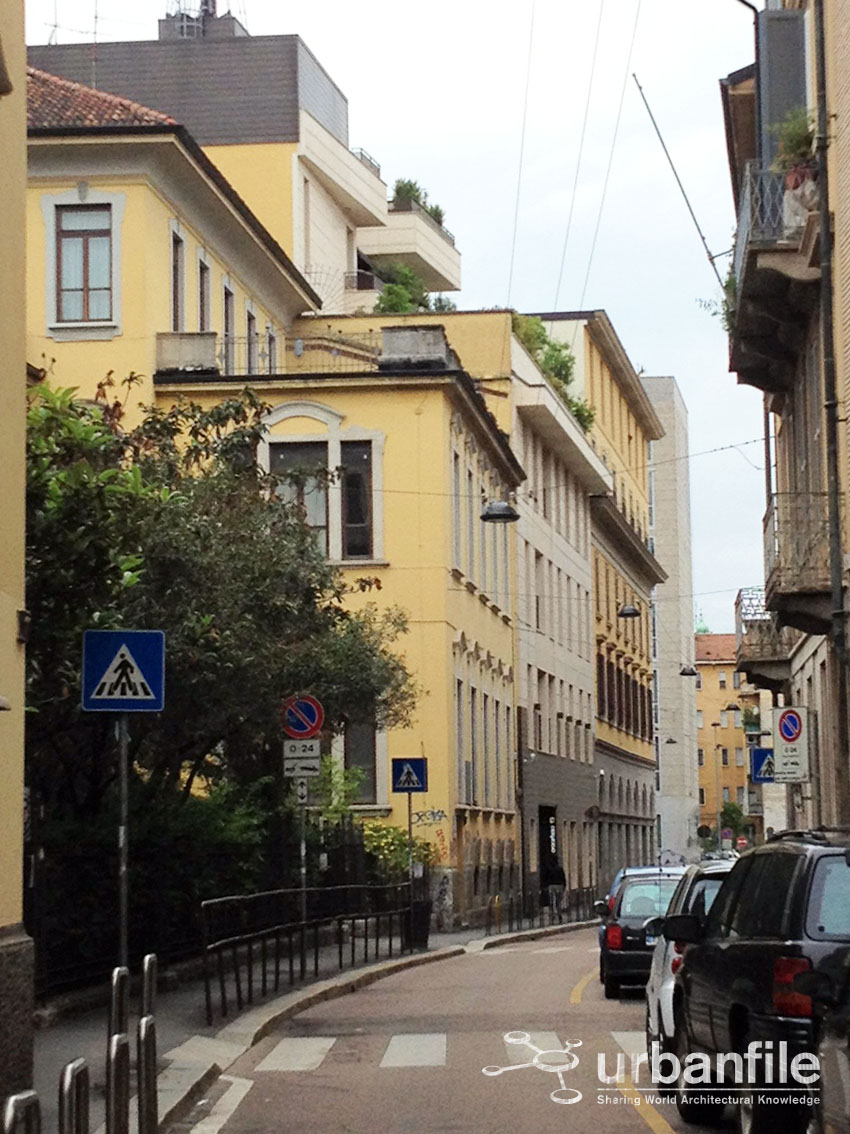 In Via Crocefisso 19 un palazzo abbastanza anonimo anni Cinquanta ad uso uffici è stato convertito qualche anno fa in un mix uffici e residenziale. Il sopralzo è un po’ particolare: presenta due balconi non allineati alla facciata. Per fortuna è abbastanza arretrato rispetto al fronte strada ed è poco visibile dal suolo.