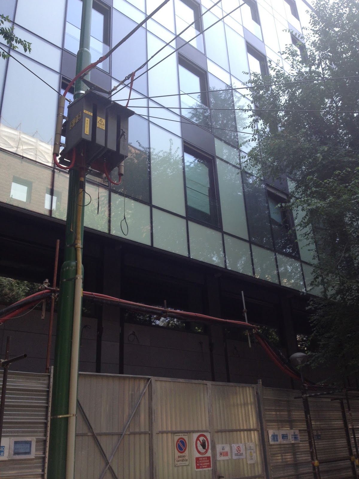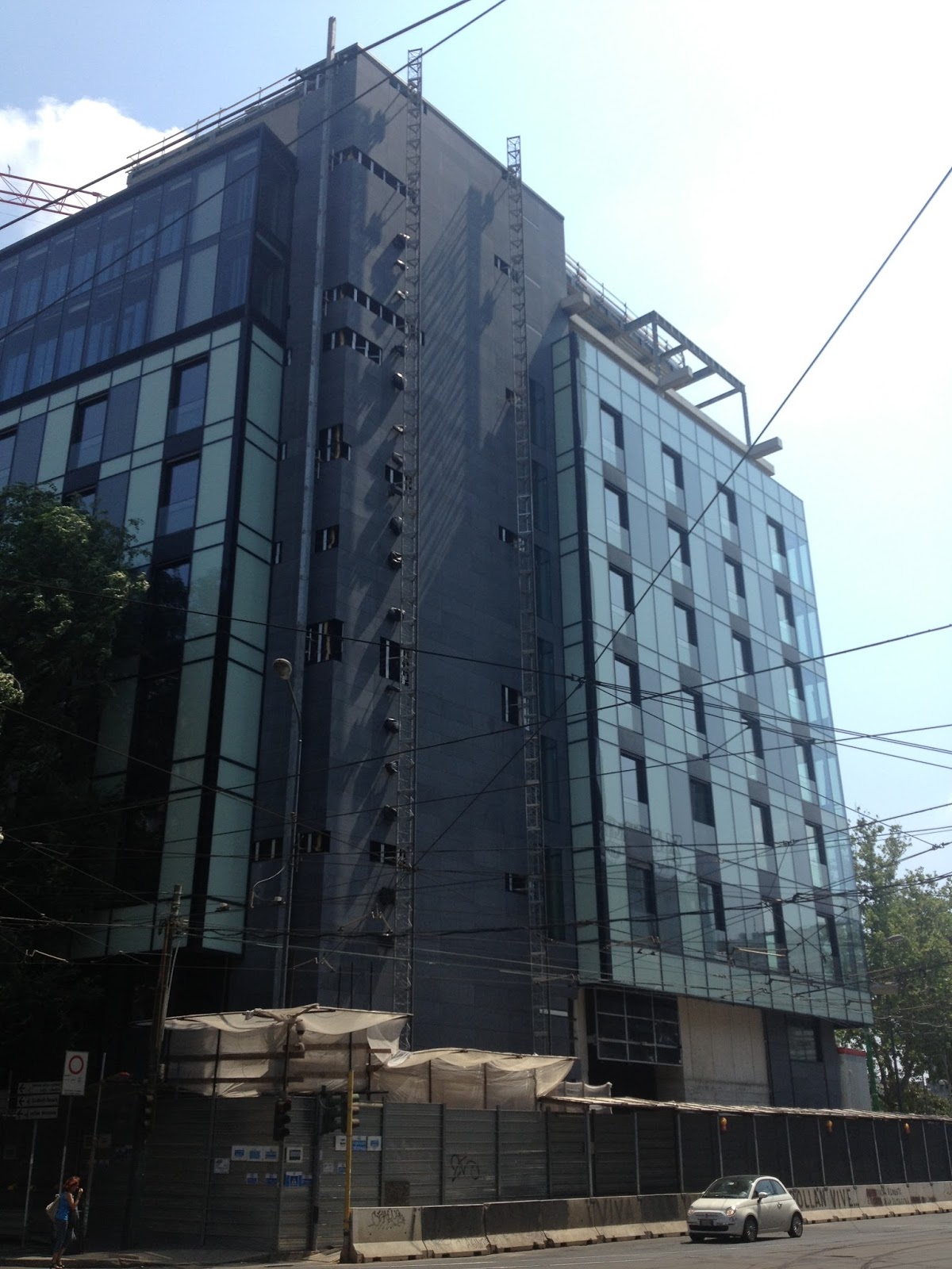 Sul retro dell’Excelsior Hotel Gallia stanno finalmente posando le pareti vetrate della parte nuova. Il risultato di questo connubio tra vecchio e nuovo non è ancora molto chiaro e non convince molti, compreso me.