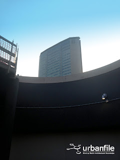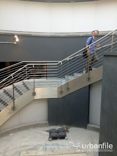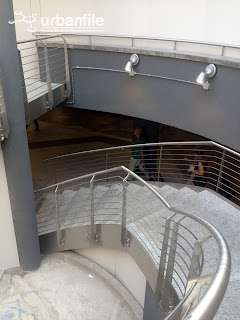 Prima impressione ottima: gli scalini in granito sembrano ben realizzati e così anche il corrimano e le ringhiere in acciaio. Manca ancora l’ascensore e il cilindro in vetro che lo contiene.