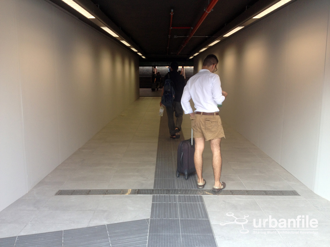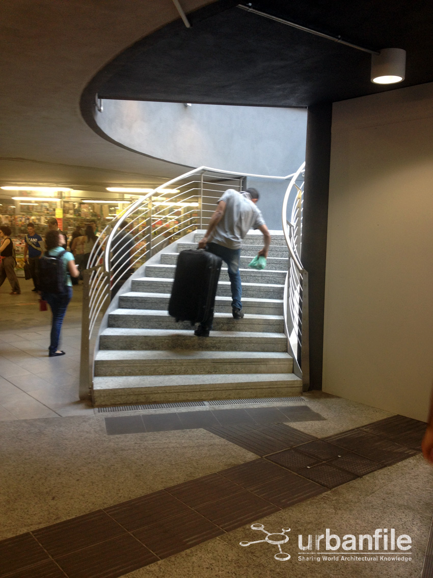 Altro appunto: per ora non c’è alcun tipo di indicazione per andare alla stazione Centrale, molte persone con valigie hanno preso questa scala che non era evidentemente la via più opportuna quando poco più avanti c’è un tapis-roulant che aiuterebbe e faciliterebbe il trasporto delle pesanti valigie.