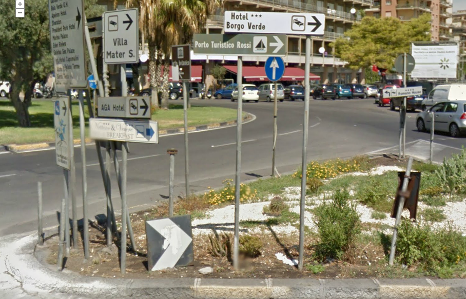 In altri casi, invece, la segnaletica verticale non esiste proprio: o meglio, esiste soltanto quella commerciale, peraltro disposta in modo estremamente disordinato, mentre non c’è alcun cartello che indichi la direzione di altri luoghi, località, strade statali e autostrade. È il caso di -da non crederci!- quasi tutto l’asse della circonvallazione, dove in seguito agli interventi di modifiche alla viabilità, al tempo delle amministrazioni Scapagnini, non è stata mai -mai!- collocata apposita segnaletica verticale. Scandaloso.