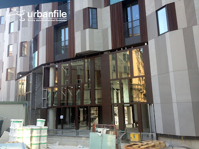 La costruzione della (a mio parere) bellissima architettura di Cino Zucchi, la Corte Verde di Corso Como, a porta Garibaldi, è a buon punto. Ho scattato alcune foto che mostrano dettagli finora coperti da impalcature o non ancora definiti, come ad esempio le vetrate al piano terra.