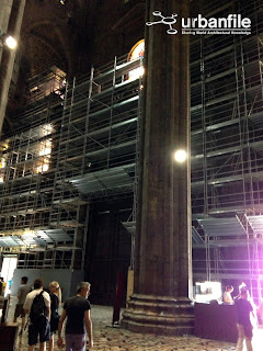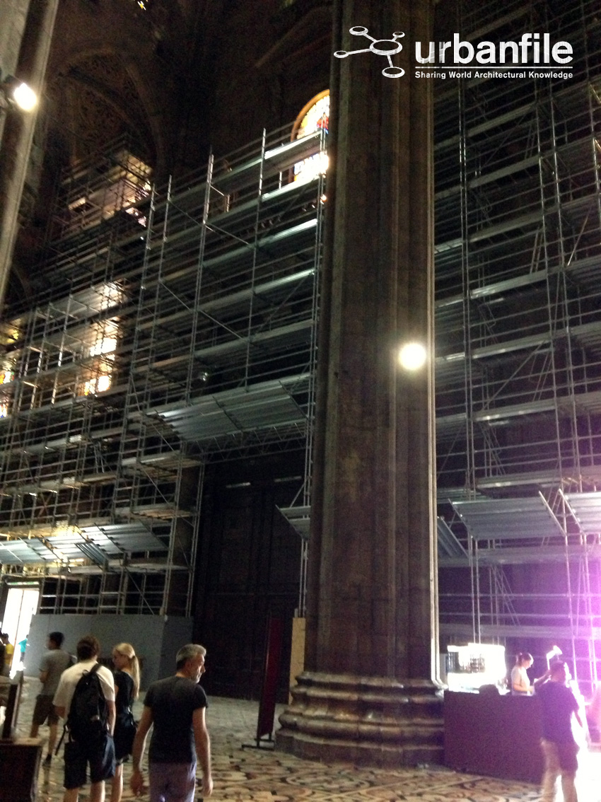 Abbiamo recentemente segnalato l’avvio dei lavori di restauro delle pareti e delle colonne interne del Duomo. Ho fatto una foto ad una colonna ripulita e ad una ancora non trattata: la differenza è notevole. I lavori sono partiti dalla navata sinistra, dal transetto ramo sinistro e dalla controfacciata. Anche la guglia principale è stata ripulita e l’impalcatura è stata abbassata di qualche metro.