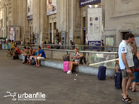 Entrando nell’ampio portico detto delle Carrozze l’impressione è di una città sporca e mal curata. Il vetro che circonda le scale mobili facendo da parapetto è a tratti in frantumi da qualche mese e nessuno pare occuparsene. E la gente che si siede sull’esiguo scalino lì accanto? Possile che non si sia mai pensato di creare posti veri dove potersi accomodare? Ovunque gente che dorme tra escrementi, urine, vomito, piccioni morti, sporcizia e auto parcheggiate. Gli unici dettagli curati e puliti parrebbero essere i cartelloni pubblicitari.