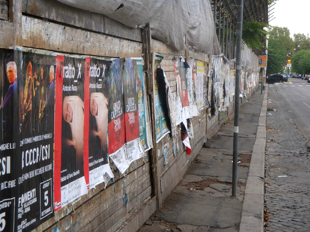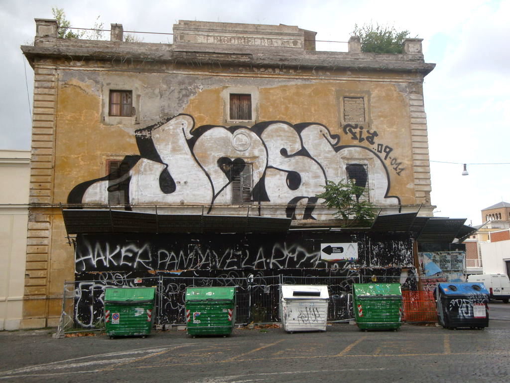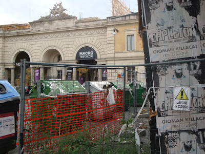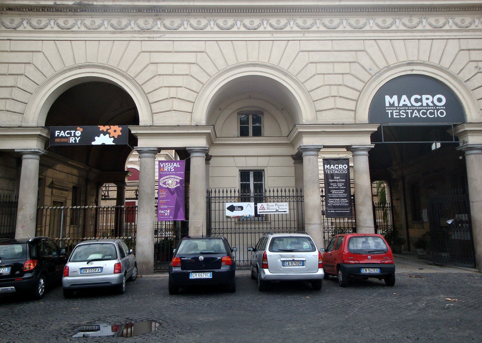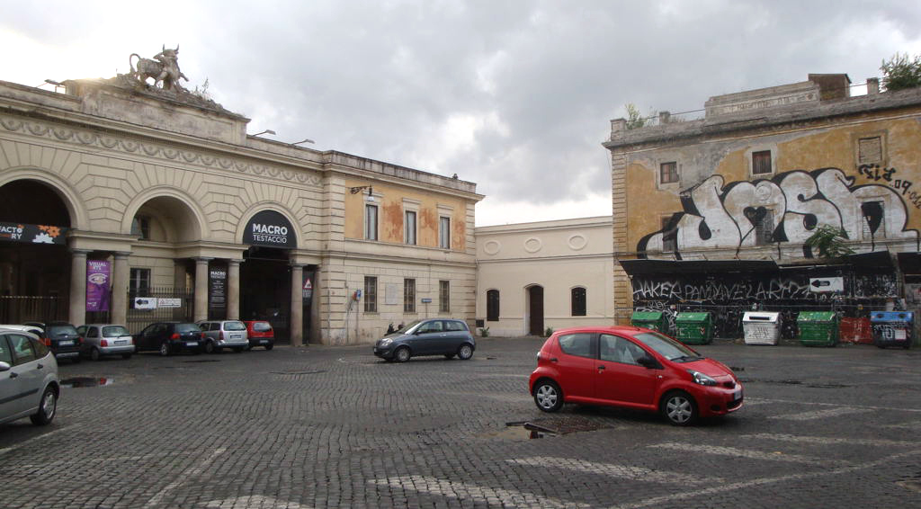 E’ mai possibile che il Macro Testaccio debba versare in queste condizioni? Con le macchine parcheggiate davanti all’ingresso, i cassonetti in bella vista, una parte dell’edificio ancora diroccata e coperta di scritte e di manifesti abusivi. Perché non realizzare qui una grande piazza pedonale per accogliere in modo degno i visitatori?