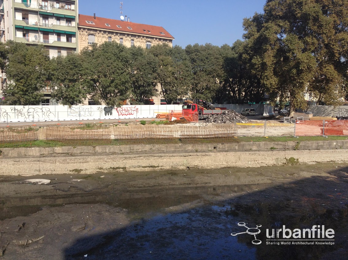 Nel cantiere della Darsena si stanno tuttora mettendo le basi per quelli che saranno i lavori veri e propri. Approfittando dell’attuale asciutta stagionale, la mia sensazione è che si stia approntando una sorta di diga per consentire all’acqua del Naviglio Grande di continuare a scorrere regolarmente verso il Naviglio Pavese anche durante lo svolgimento dei lavori di rifacimento della Darsena, che dovrebbero concludersi nella primavera del 2015.