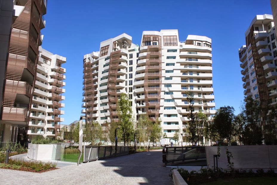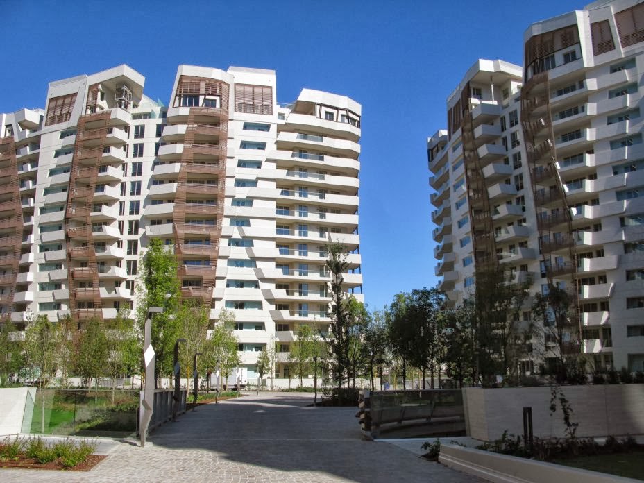 Ecco una sequenza di foto prese dal sito di Daniel Libeskind che mostrano le residenze a CityLife pronte per essere consegnate, con il giardinetto appena sistemato a verde, impalcature e gru eliminate.