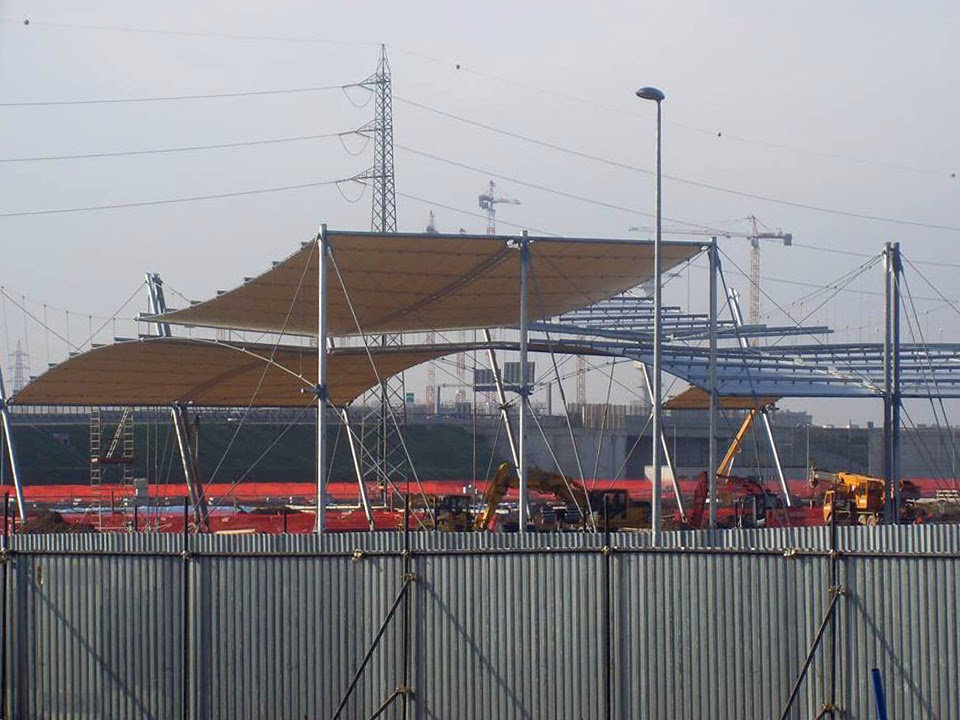 Lungo il “Decumano” sono da poco comparsi i tralicci e le coperture a tenda che ripareranno dal sole e dalla pioggia i futuri visitatori dell’EXPO.