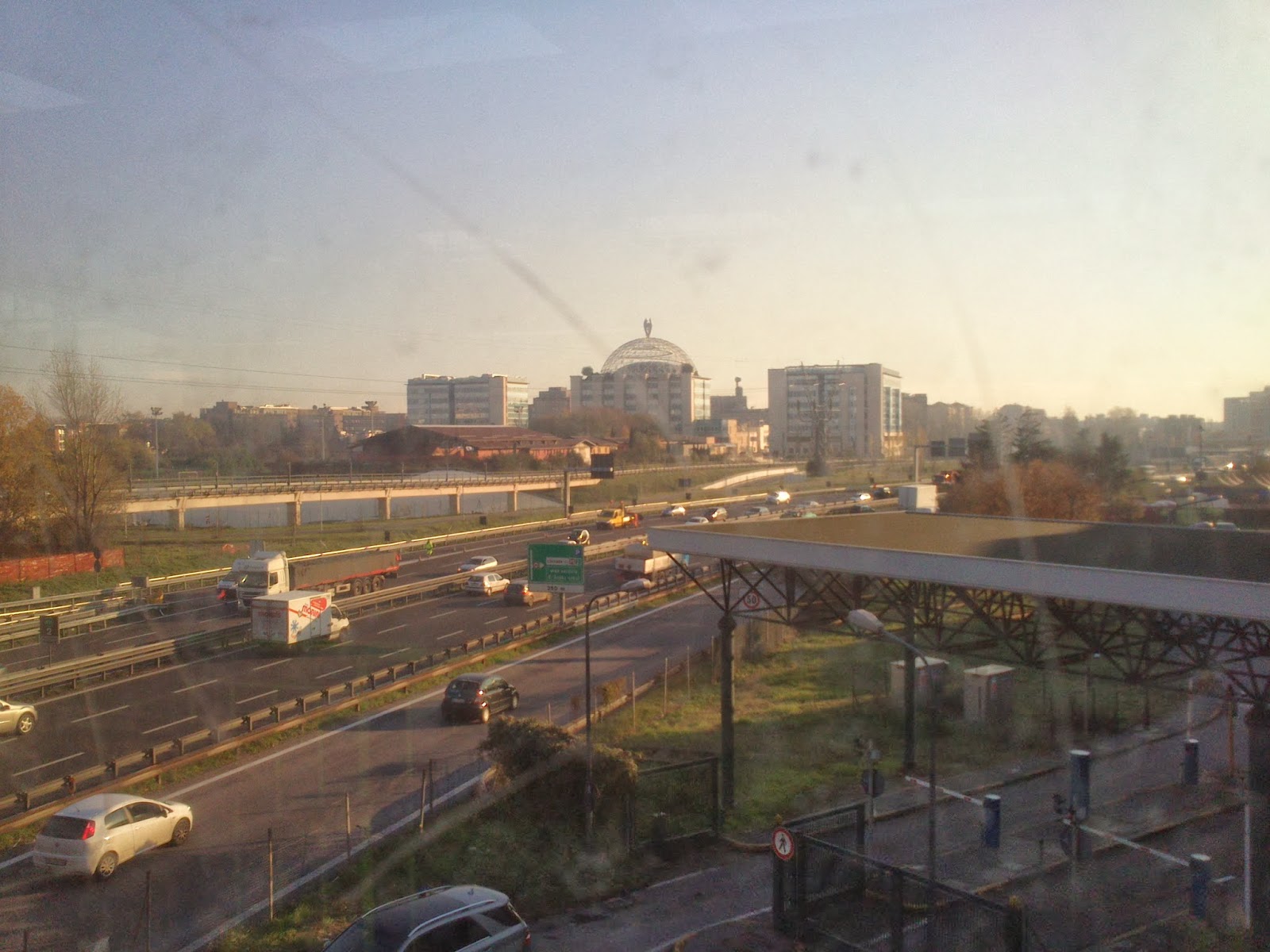 | Vista dalla stazione di Cascina Gobba M2: tangenziale est e Milano 2. Una sola fila di piccole finestre dai vetri sporchi. Anche la stazione vorrebbe una “ritoccatina”. |